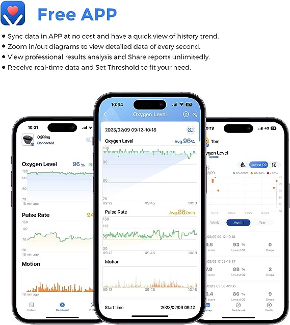 Built-in Memory: O2ring device stores four groups of 10-hour data. When the device is connected to the APP via Bluetooth, the data will be uploaded automatically Enjoy the convenience of data-tracking that's effortless and reliable - no additional hardware required! Completely customize your sleep monitoring journey, with the power to analyze health and lifestyle trends over time..