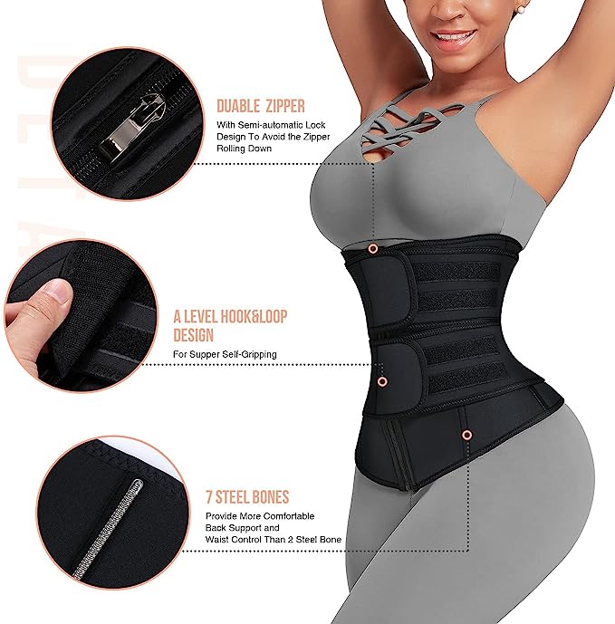 Abdomen double-layer compression widespread design. Double Belt + zipper combo, plus sticky adhesive. Double strap waist trainer boosts activity to lower abdomen, delivering a unique feeling.